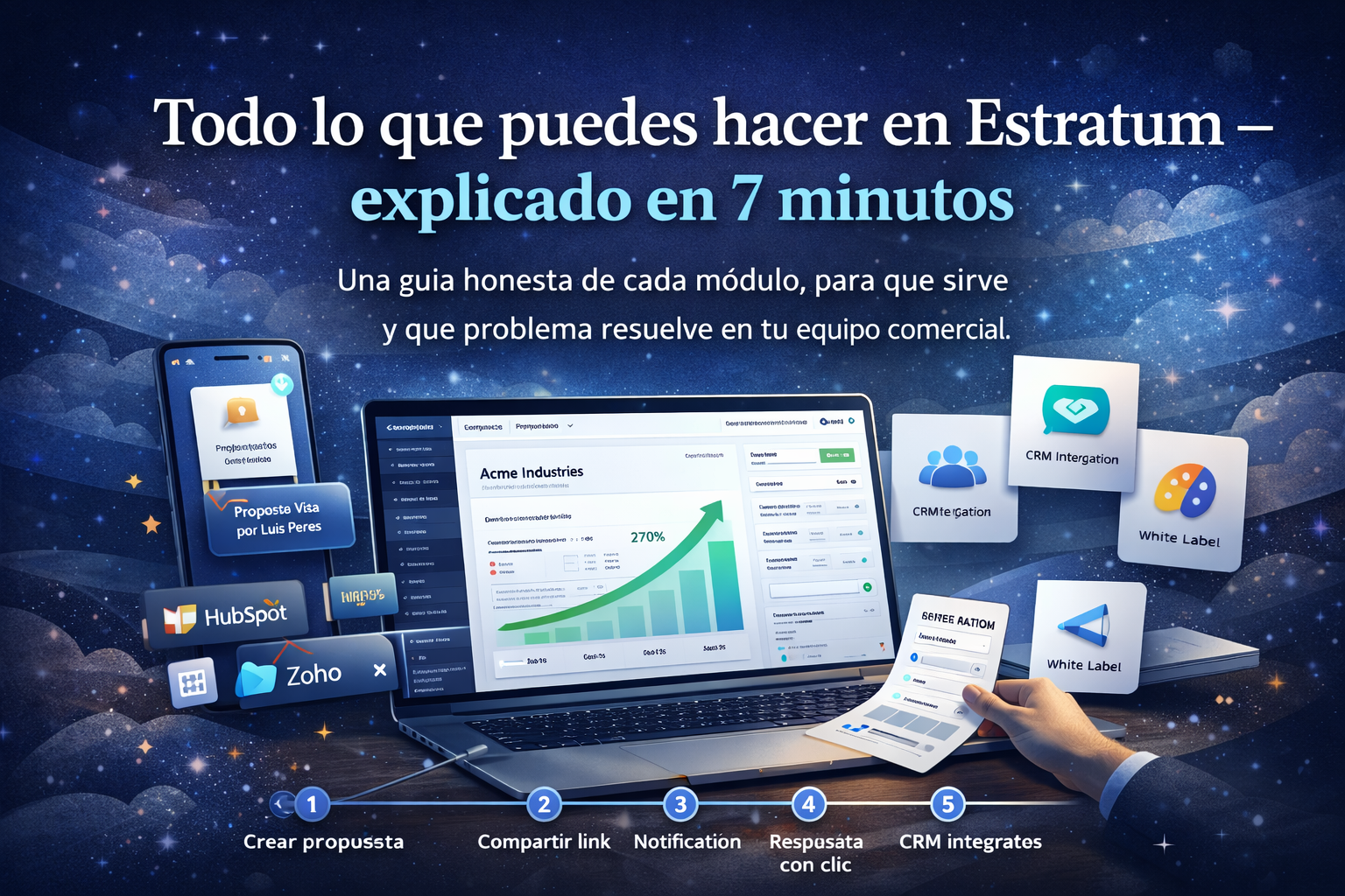 Estratum es un sistema completo de gestión del proceso comercial: desde que decides crear una propuesta hasta que el cliente la acepta y el deal entra al CRM. Esta guía cubre exactamente qué hace cada parte y por qué importa.
